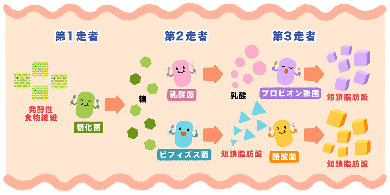 まず、腸内細菌が生成する短鎖脂肪酸がいかに重要かわかってきたところが大きいです。短鎖脂肪酸は、腸内細菌が食物繊維を発酵させてつくる栄養分のこと。腸の動きを良くして腸壁のバリア機能を高めたり、炎症抑制、免疫システムの調整、血糖値をコントロールして体脂肪の増加を抑えるなど身体にとって有益な仕事をしてくれるのですが、この短鎖脂肪酸は発酵性食物繊維を摂ることで多く生成できることがわかっています。また発酵性食物繊維は、クロスフィーディング(腸内細菌の餌のリレー)を誘引します。この餌のリレーが新たな短鎖脂肪酸を生成するという良いサイクルを生み出していくのです。